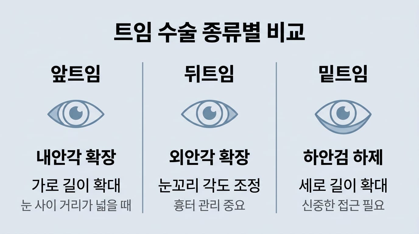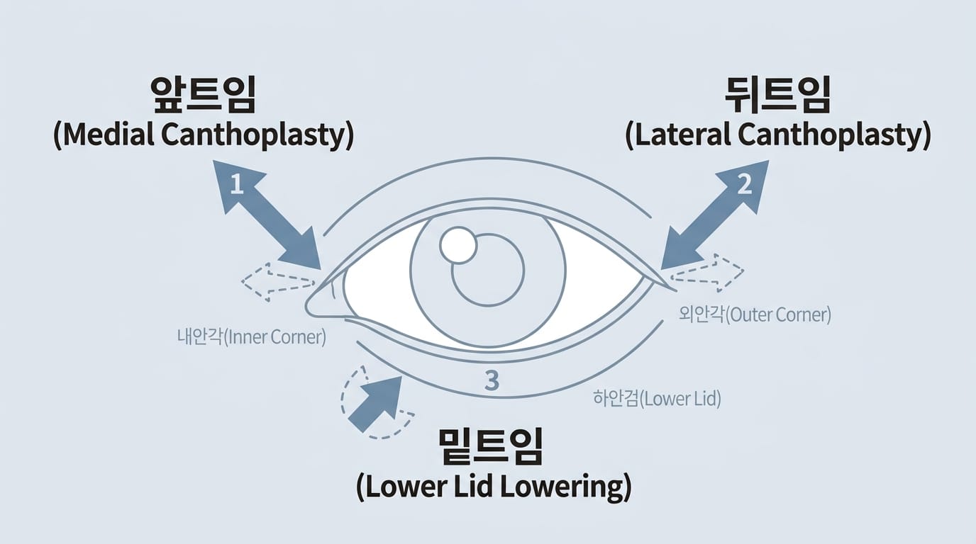 "앞트임", "뒤트임", "밑트임" — 이 용어들은 단순한 이름이 아니라 완전히 다른 수술 방식을 의미합니다. 같은 "트임"이라는 단어를 써도, 어느 부위를 조정하는지에 따라 결과가 달라집니다.