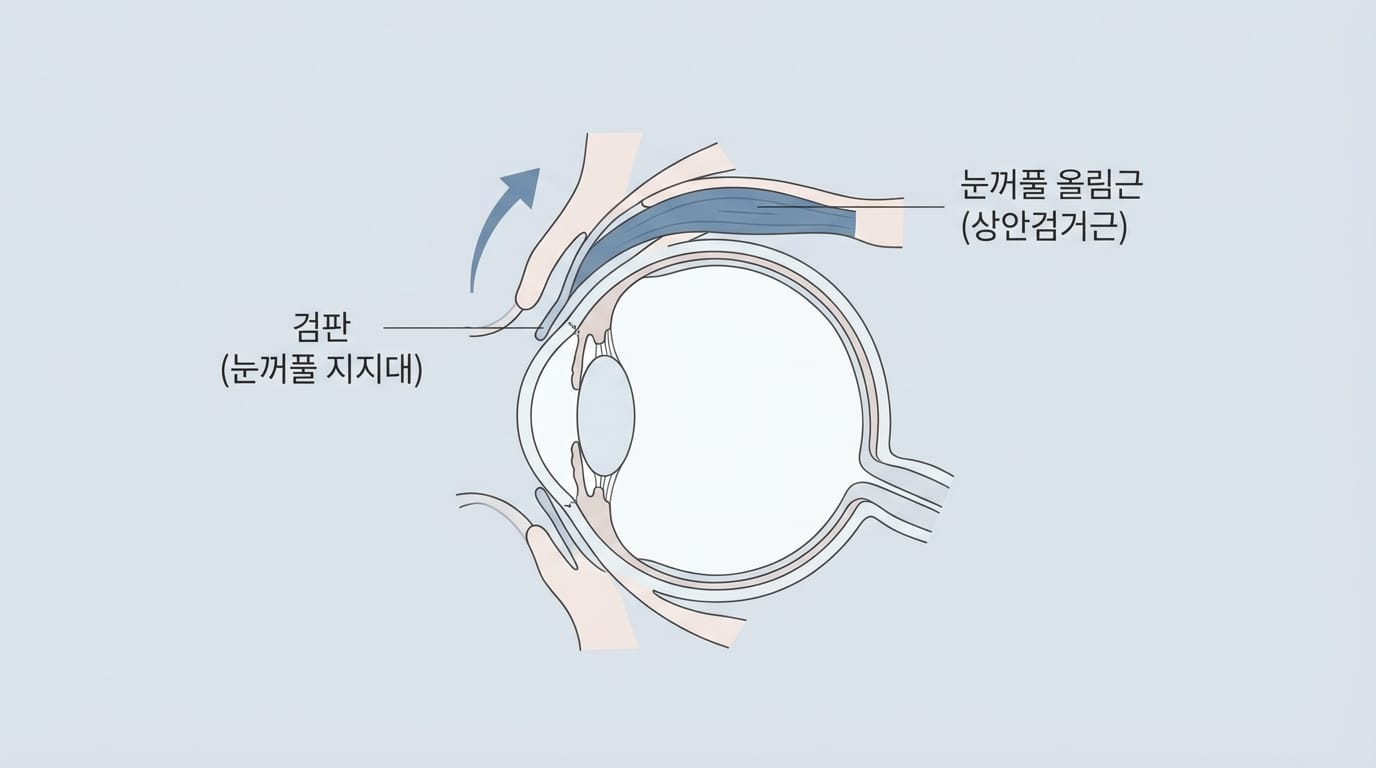 쉽게 비유하자면, 블라인드를 올리는 줄이 느슨해진 것과 비슷합니다. 줄을 당겨도 블라인드가 끝까지 올라가지 않는 것처럼, 상안검거근의 힘이 약하면 눈꺼풀이 정상 위치까지 올라가지 못하는 것이지요.