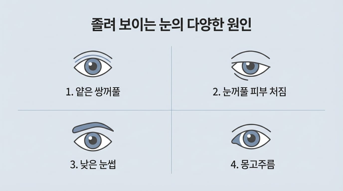 졸려 보이는 인상을 주는 원인은 여러 가지가 있습니다. 안검하수는 그중 하나일 뿐이지요.